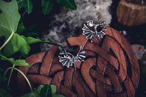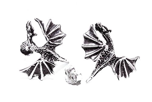 Dragon stud earrings with extended wings in trendy, antique silver style.